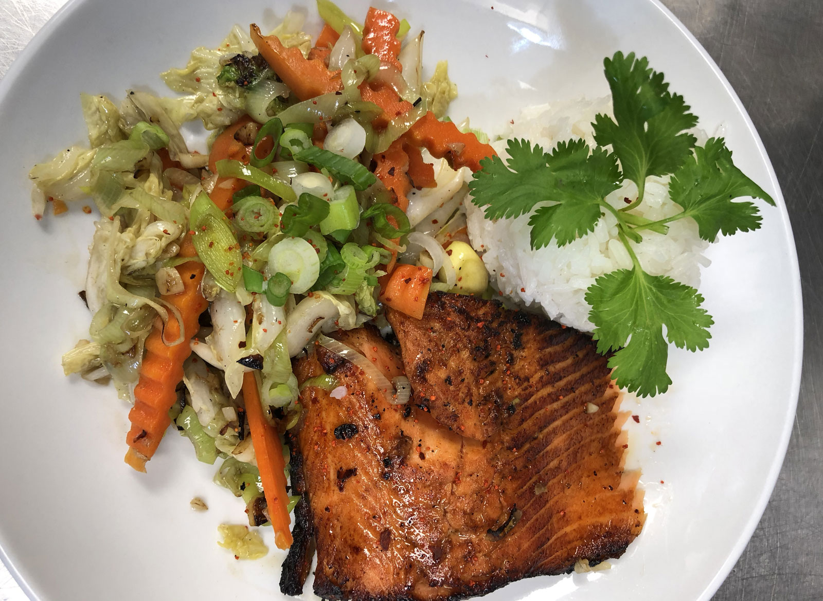 Honey Sriracha Salmon Salmon sautéed in sriracha honey sauce. Served with steamed rice and garlic buttered vegetables. $18
